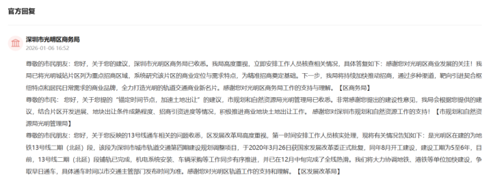该市民反映,光明城站作为光明区的重要交通枢纽,区位优势明显,但目前站区商业配套几近空白,旅客出站后难觅餐饮购物之处,也无法满足周边居民的日常消费需求。